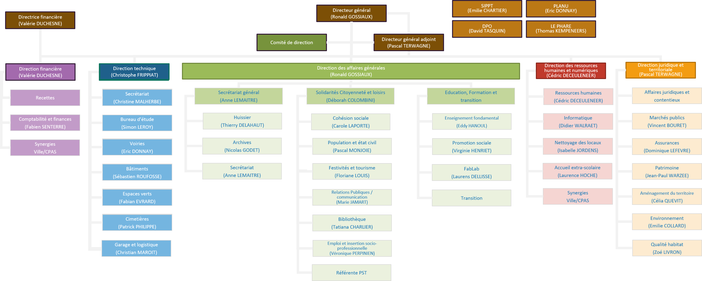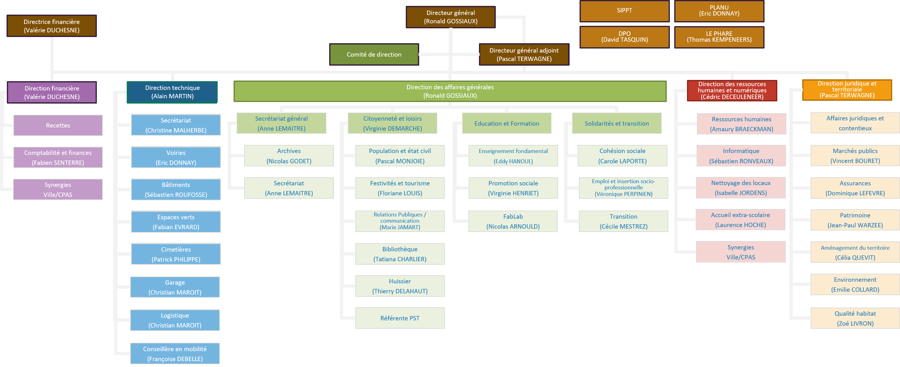 L’organigramme représente la structure d’organisation des services, indique les rapports hiérarchiques et identifie les fonctions qui impliquent l’appartenance au Comité de direction. L’organigramme est donc un outil de management qui permet de visualiser l’organisation des moyens humains effectivement affectés dans l’Administration.